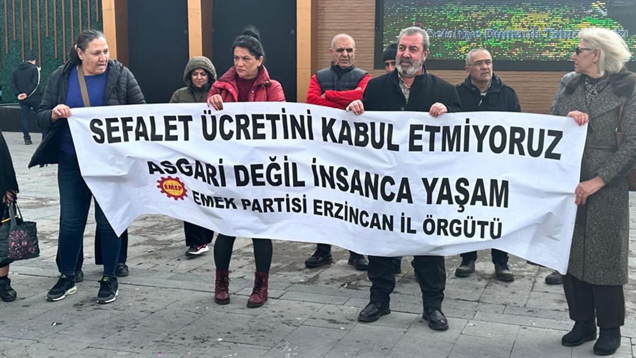 Emek Partisi (EMEP) Erzincan İl Başkanlığı tarafından Erzincan Dörtyol Cumhuriyet Meydanı’nda düzenlenen basın açıklamasında, 2026 yılı için açıklanan 28.075 TL’lik asgari ücret protesto edildi. Parti adına yapılan açıklamada, belirlenen ücretin milyonlarca emekçiyi açlık ve yoksulluğa mahkûm ettiği ifade edildi