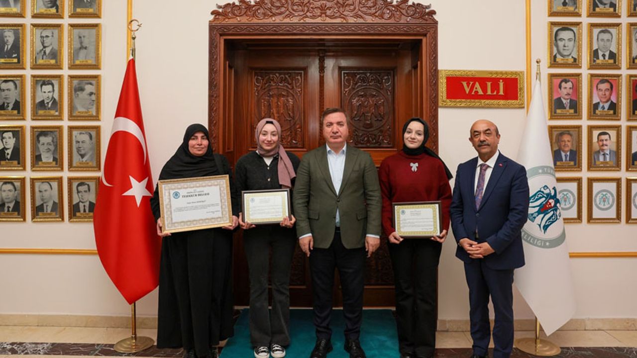 Vali Aydoğdu, tüm zorluklara rağmen çalışkanlığı, azmi ve fedakârlığıyla örnek bir duruş sergilediği için Birsen Kömürcü’ye; bir yandan eğitimlerine devam ederken diğer yandan annelerine destek olan Eda ve Melisa Kömürcü’ye “Teşekkür Belgesi” takdim etti.