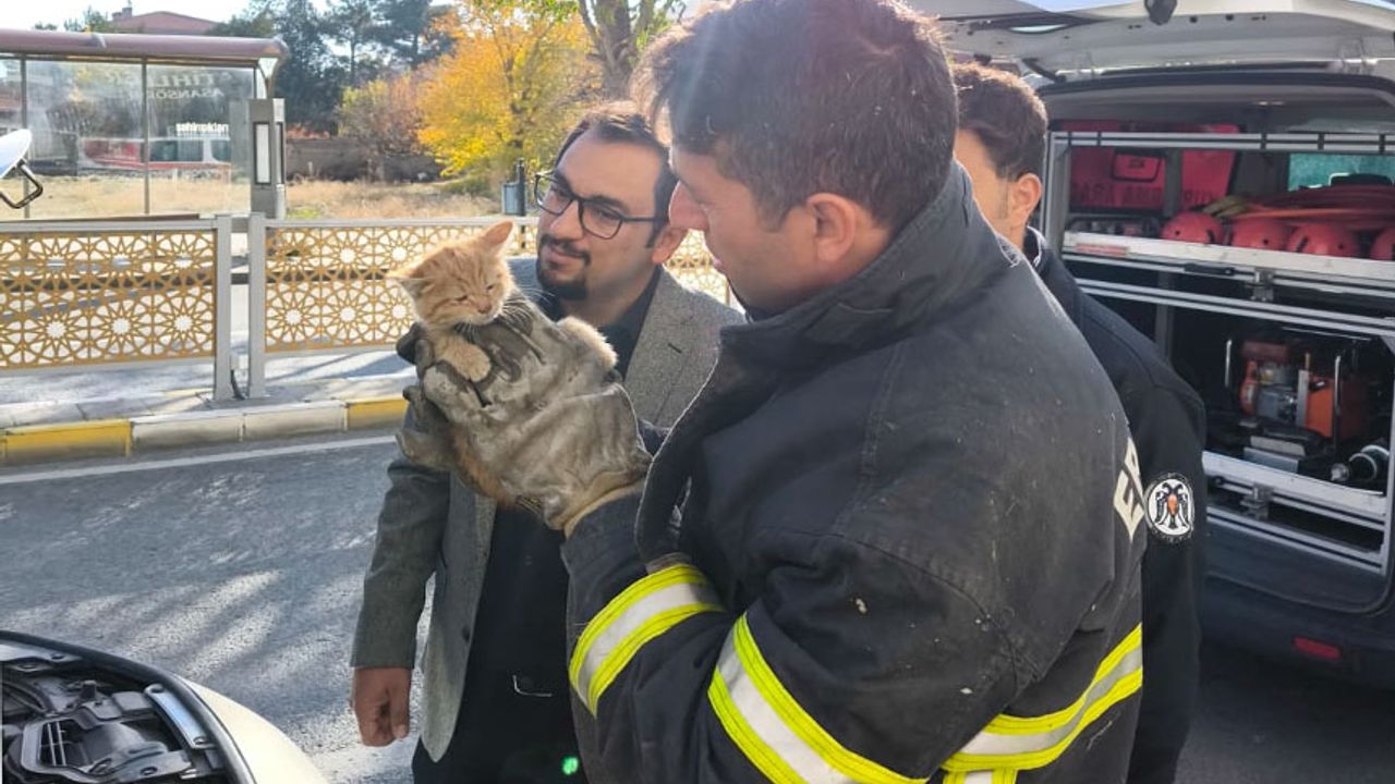 Erzincan’da Yeni Mahalle 314. Sokak’ta bir aracın motor kısmına sıkışan yavru kedi, itfaiye ekiplerinin müdahalesiyle kurtarıldı.