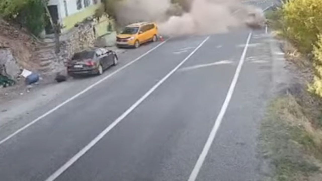 Türkiye Elektrik Dağıtım Anonim Şirketi (TEİAŞ) tarafından yol üzerinde yapılan elektrik hattı çalışması sırasında dağ yamacından kopan büyük bir kaya kütlesinin hızla yola doğru yuvarlanmasıyla tehlikeli anlar yaşandı.